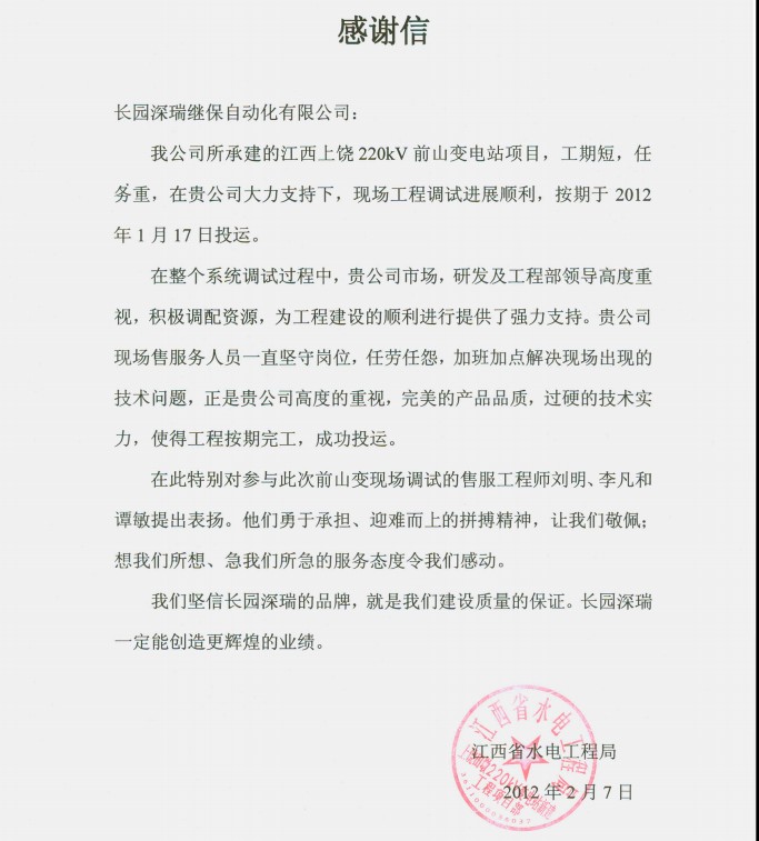2012年1月17日,我司在江西省的第一座220KV综自变电站——江西上饶220KV前山变顺利投运,并于近日向我公司发来一封感谢信。信中对我公司在该站调试过程中给予的支持表示感谢,并对刘明、李凡、谭敏三位售服工程师的服务表示赞扬。